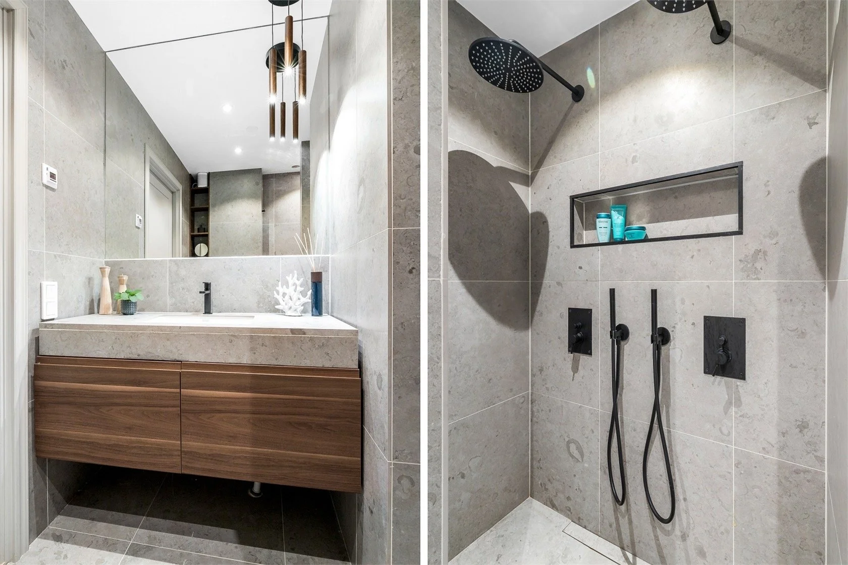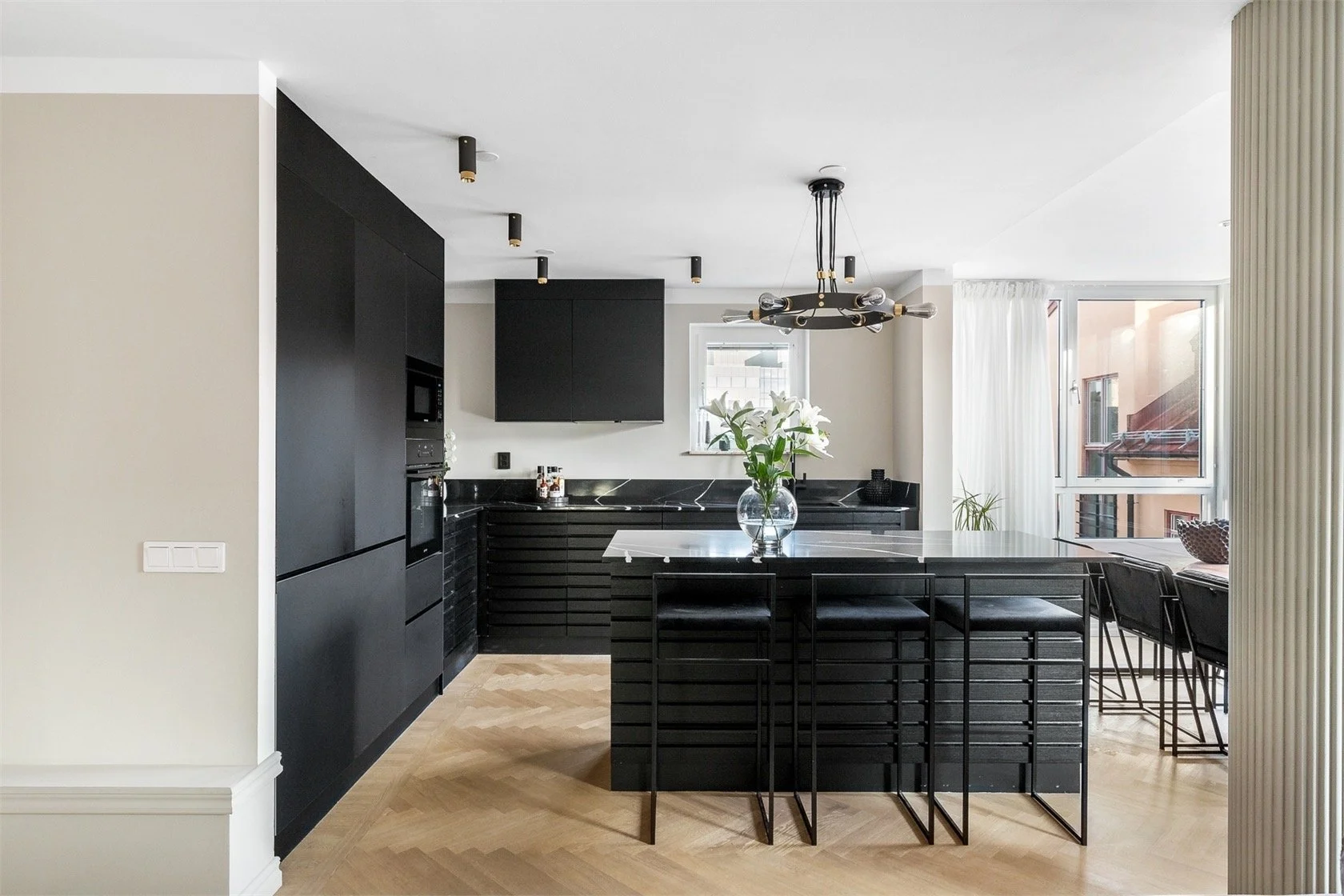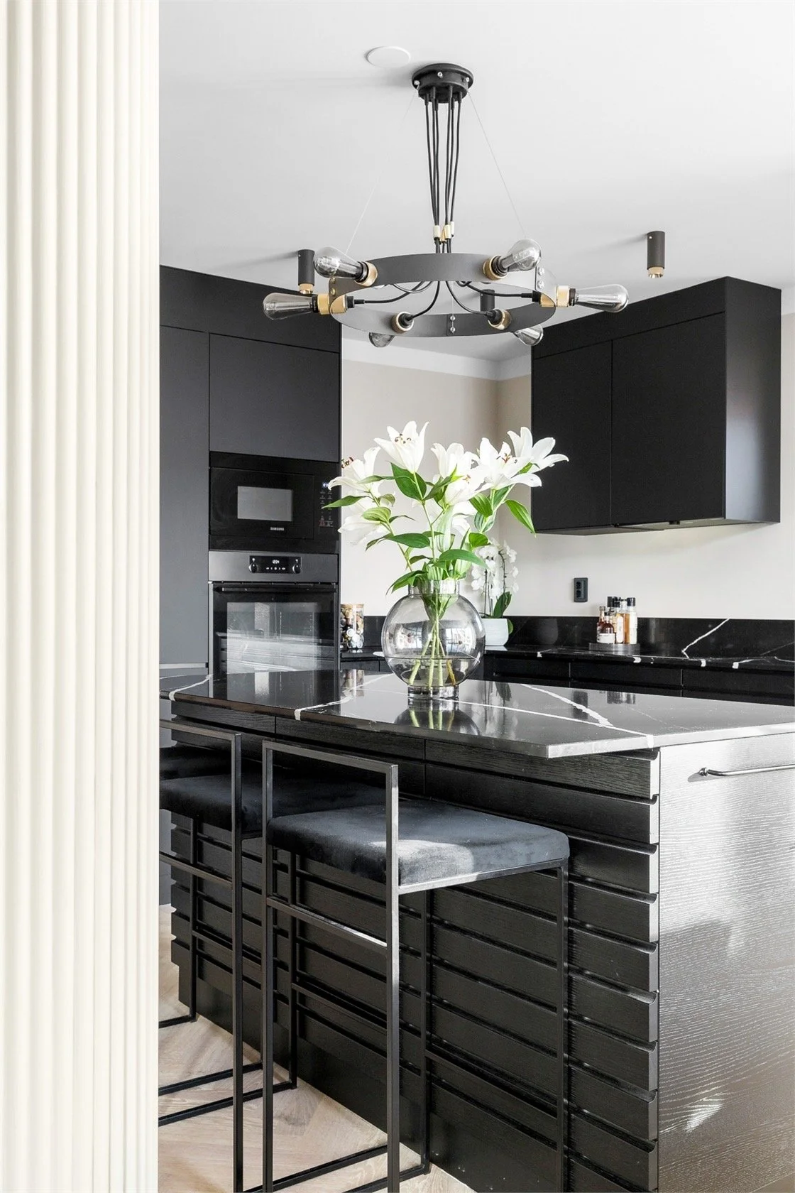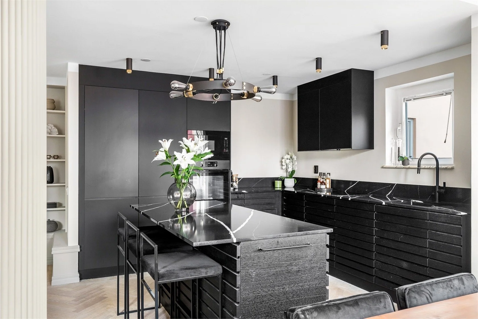 Köket kommer från Kvik och har fått en lyxig bänkskiva i Nero Marquina-sten. I både badrum och kök har vi använt Tapwell-produkter för en enhetlig och stilren känsla.